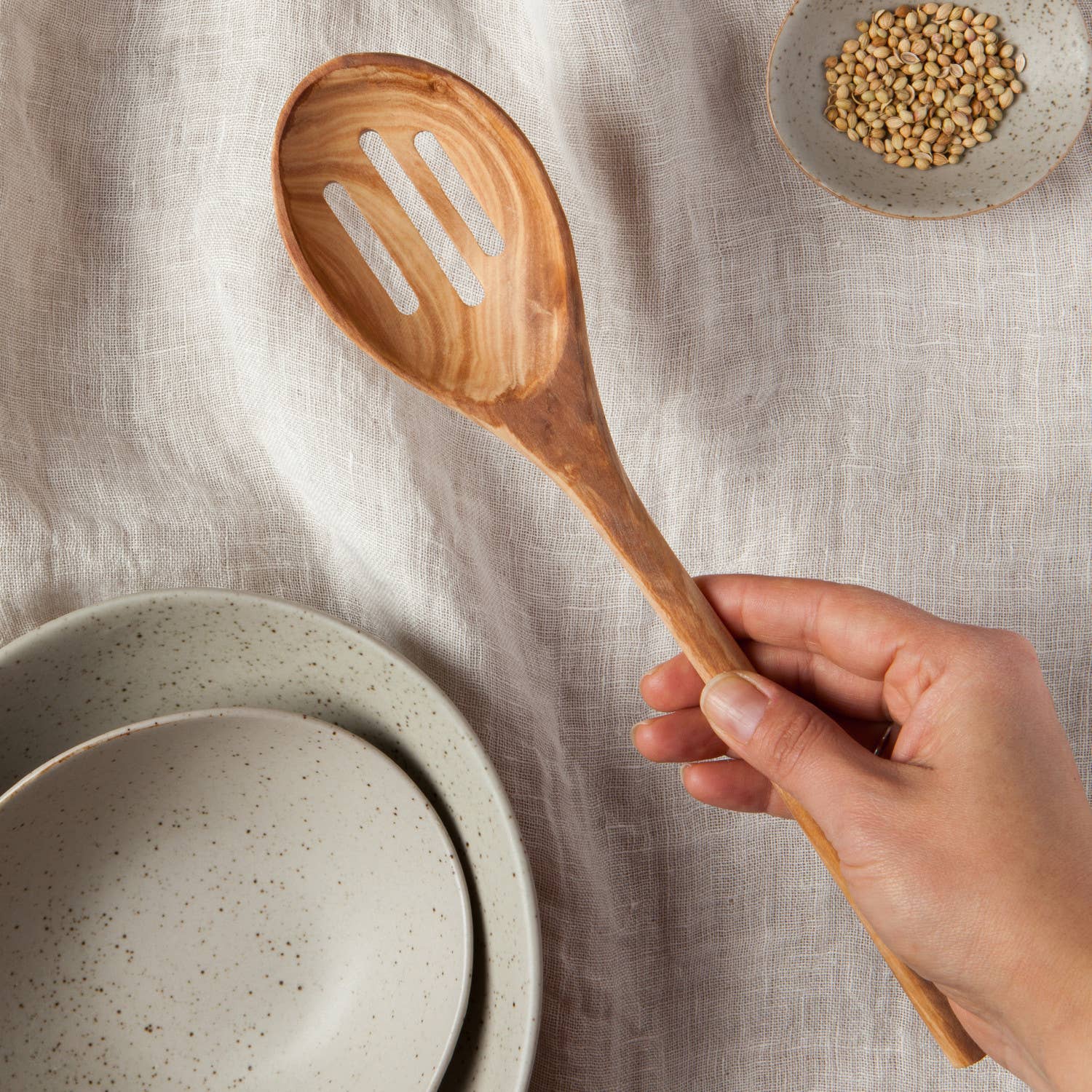 Olive wood radiates the warmth and richness of the a Mediterranean grove. A hardwood, it is sustainable and long-lasting. Made in Tunisia and are responsibly sourced from the producing branches of olive orchard trees. Grain patterns and colors vary from piece to piece - each one will be unique.